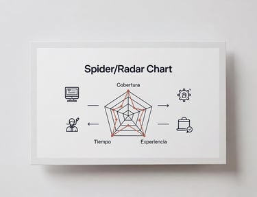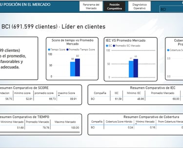 selecciona una compañía y visualiza cómo rinde versus el mercado en cada dimensión. Identifica dónde lidera (ventaja competitiva), dónde está en promedio (paridad), y dónde pierde (brecha a cerrar).