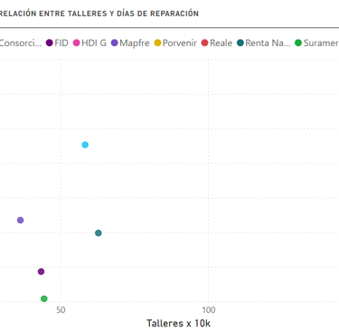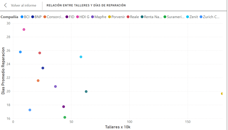 La correlación entre cantidad de talleres y tiempo de reparación es 0.03 (prácticamente cero). BCI tiene 437 talleres y tarda 42.5 días en siniestros graves. Sudamericana G tiene 810 talleres y tarda 23.5 días. La eficiencia operativa importa más que la cobertura bruta.