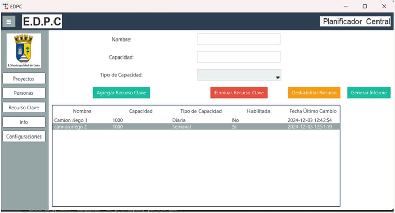 Permite registrar recursos de capacidad limitada (ejemplo: camión aljibe con 10.000 litros semanales). Al asignar tareas que consumen ese recurso, el sistema controla que no se exceda la capacidad disponible. También permite habilitar/deshabilitar recursos según su estado operativo y genera informes de utilización.